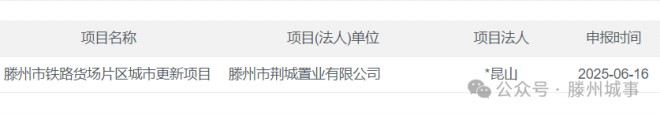 6月16日,滕州市鐵路貨場片區城市更新項目立項,項目法人單位為滕州市荊城置業有限公司。