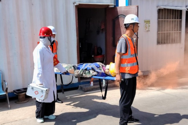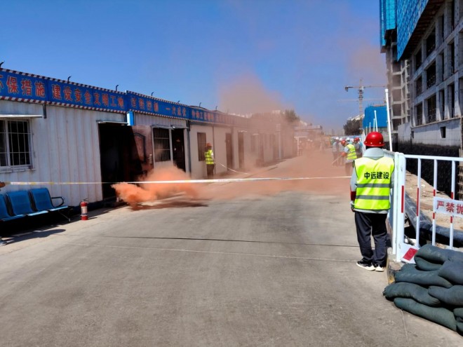 演練以項目現場突發火情為背景,真實還原火災發生和救援的場景:現場人員發現險情后,立即啟動手動報警裝置,同時利用滅火器嘗試撲救;項目應急指揮部第一時間響應,多部門協同作戰;滅火組攜帶消防水帶、水槍等設備,采取“分隔包圍、重點突破”戰術壓制火勢;疏散組手持擴音器,引導施工人員用衣物捂住口鼻,按照疏散路線快速撤離至集合點;醫療組迅速對模擬受傷人員進行止血包扎和心肺復蘇;警戒組在現場周邊設置隔離帶,疏導交通,防止次生事故發生。最終火警和人員險情解除,大家有條不紊、行動迅速,成功完成演練。