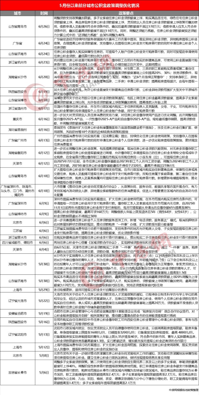 據中房網不完全統計,自今年5月份以來,全國至少已有北京、天津、上海、重慶4個直轄市,廣東省、江蘇省以及山東省青島市、濰坊市、濟南市、淄博市,浙江省杭州市、麗水市、溫州市,遼寧省大連市、沈陽市,湖南省衡陽市、長沙市,湖北省恩施州,四川省成都市、德陽市,安徽省合肥市,陜西省西安市,吉林省長春市等地已相繼行動,調整優化了公積金相關政策。