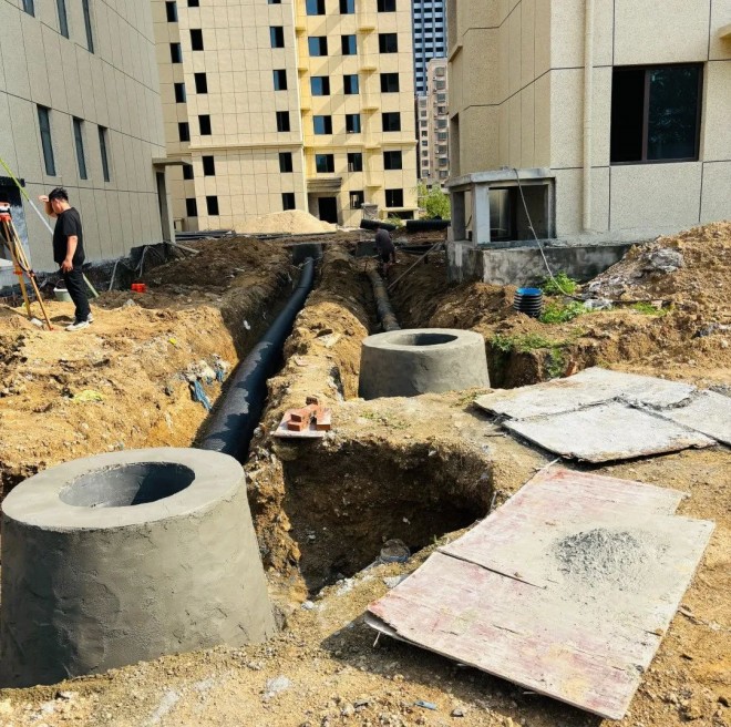 室外雨污管網鋪設:管網工程正在緊鑼密鼓施工,工人們如同地下“織網師”,精心鋪設每一段管道。從坡度校準到接口密封,每一處細節都經過嚴格檢測,確保排水系統高效運行,為未來的舒適生活保駕護航。