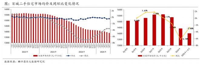 整體來看,今年前6月100個重點城市的房價為14023元/㎡,較2024年下跌2.8%。截至6月,百城二手房價格環比連續下降28個月,同比連續下降30個月,二手房價格下行態勢并未扭轉。