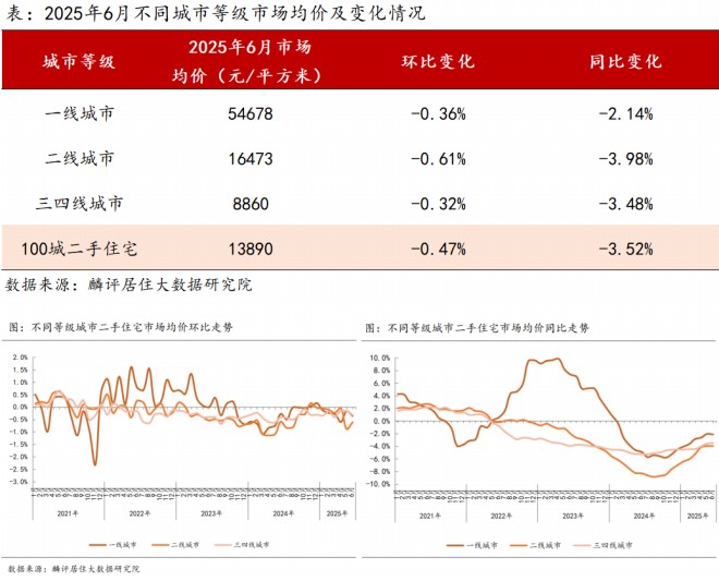 報告顯示,6月一線城市市場均價為54678元/平方米,環比下跌0.36%,同比下跌2.16%;二線城市均價為16473元/平方米,環比下跌0.61%,同比下跌3.98%;三四線城市均價為8860元/平方米,環同比分別下跌0.32%和3.48%。