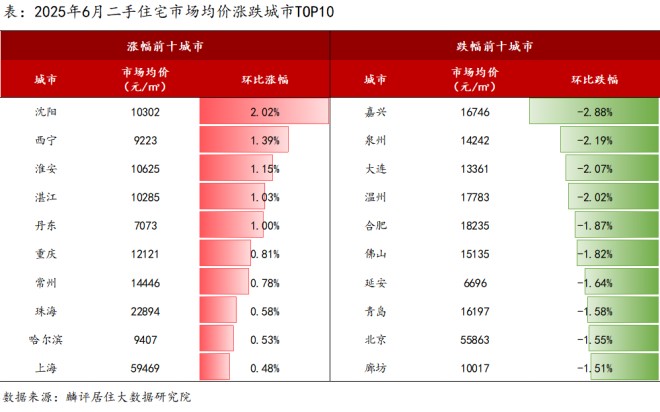 從環比跌幅前10城市來看,跌幅維持在1.5%-2.9%之間,繼續維持跌幅大于漲幅的局面。其中,嘉興、泉州、大連和溫州房價環比跌幅大于2%。一線城市中僅北京上榜,其6月房價跌幅為-1.55%。