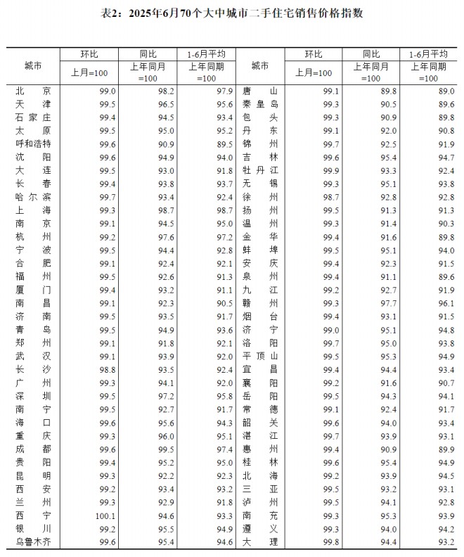 二手住宅價格方面,國家統計局數據顯示,6月份環比上漲城市有1個,比上月減少2個;同比上漲城市為0,與上月一致。