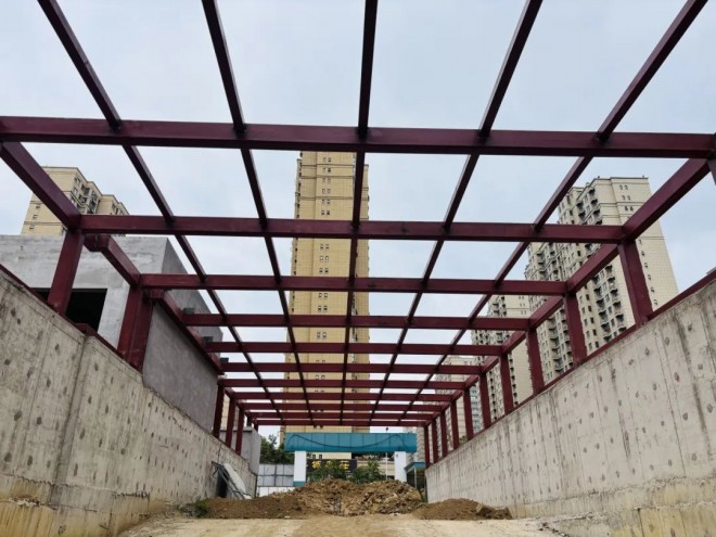 入口頂棚施工啟動:車庫入口頂棚結構已開始搭建,未來將配備防雨防塵設計,提升出入便利性與整體社區形象。