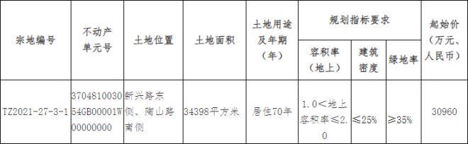 TZ2021-27-3-1號宗地,位于新興路東側、陶山路南側。土地面積34398平方米,土地用途為居住70年。