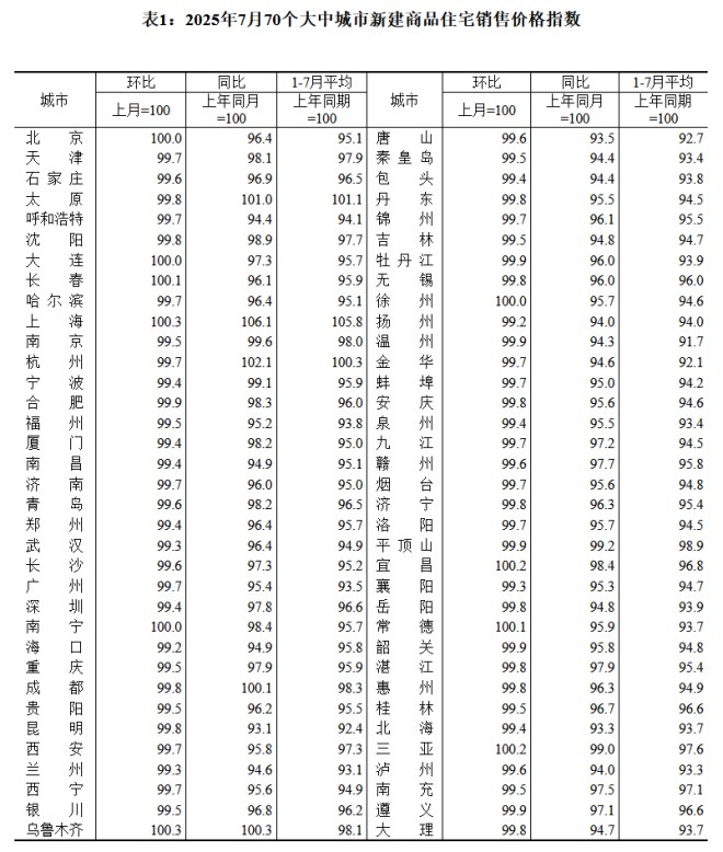 國家統計局近日發布的《70個大中城市商品住宅銷售價格變動情況》顯示,房價仍處于調整階段。7月70個大中城市中,各線城市商品住宅銷售價格環比下降,同比降幅整體有所收窄。