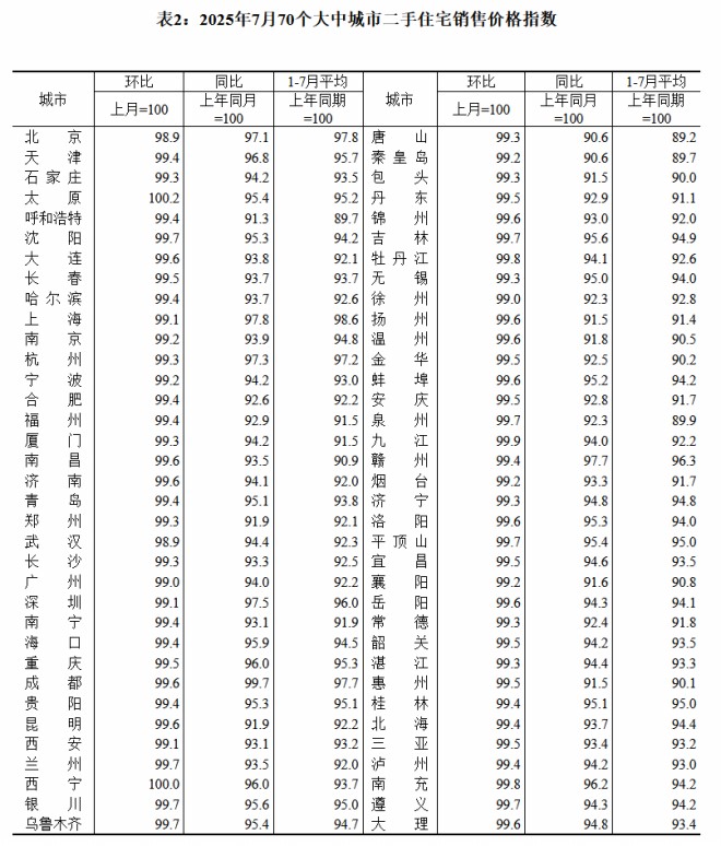 二手住宅價格方面,國家統計局數據顯示,7月份環比上漲城市有1個,與上月持平;同比上漲城市為0,與上月一致。