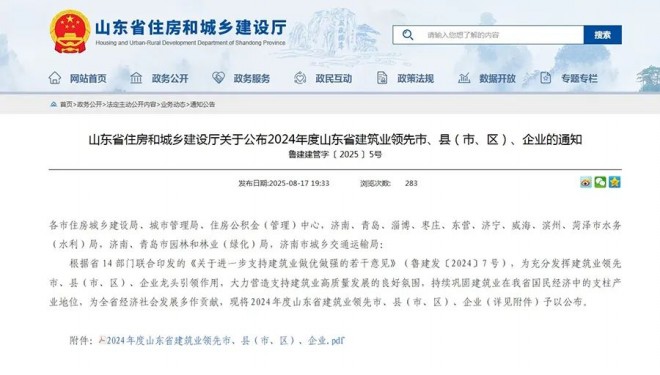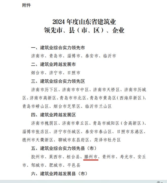 近日,山東省住房和城鄉建設廳公布了2024年度山東省建筑業領先市、縣(市、區)及企業名單,滕州市再次榮膺“山東省建筑業綜合實力領先縣(市)”稱號。這是滕州自該評選開展以來,連續第七次獲得此項榮譽,充分彰顯了其在建筑業領域的持續領先地位和綜合實力。