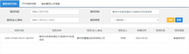 2025年9月2日,滕州市龍泉街道后大廟城中村改造項目立項,項目單位為滕州班墨建設投資有限公司。