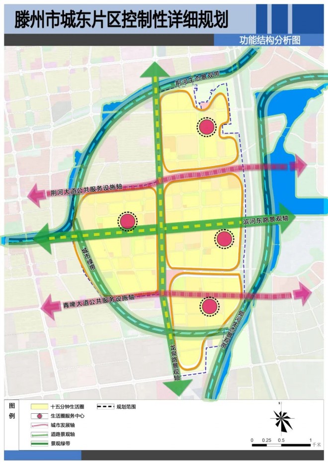 項目位于城東片區,根據規劃,滕州城東片區北至荊河,南至騰飛路、郭河,東至墨子大道,西至河濱東路,總用地面積865.87公頃。目標定位為墨子湖畔,宜居宜業宜游的高品質城市片區。通過引綠、濱水、增服的整體構思,形成“三帶、四軸、四片區”的空間結構。