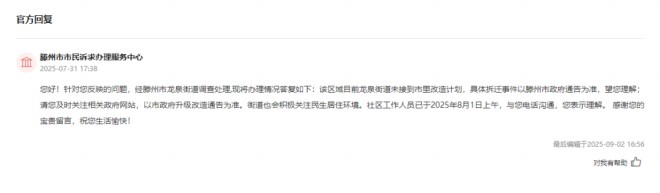 您好!針對您反映的問題,經滕州市龍泉街道調查處理,現將辦理情況答復如下:該區域目前龍泉街道未接到市里改造計劃,具體拆遷事件以滕州市政府通告為準,望您理解;請您及時關注相關政府網站,以市政府升級改造通告為準。街道也會積極關注民生居住環境。社區工作人員已于2025年8月1日上午,與您電話溝通,您表示理解。 感謝您的寶貴留言,祝您生活愉快?。?025-09-02 16:56)