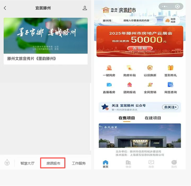 2025年滕州市房地產云展會采用“線上線下,雙線布展”形式,線上利用“宜居滕州房源超市”微信小程序開展發放5萬元購房消費券活動,線下參展項目現場同步開展相關營銷活動,全方位展示項目樓盤信息和房企營銷活動。