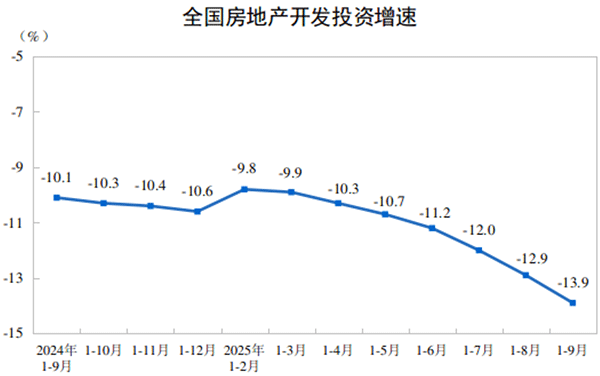 具體來看,房地產開發投資增速方面,累計同比跌幅再擴大。數據顯示,1-9月份全國房地產開發投資67706億元,同比下降13.9%;其中,住宅投資52046億元,下降12.9%。