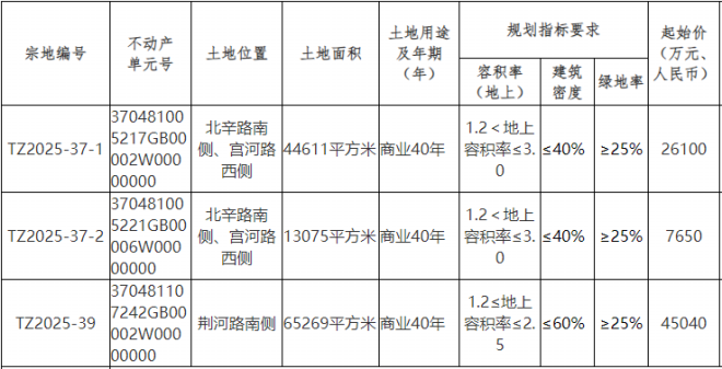 TZ2025-39號宗地,位于荊河路南側。土地面積65269平方米,土地用途及年期為商業40年。規劃指標要求:1.2≤地上容積率≤2.5,建筑密度≤60%,綠地率≥25%。起始價45040萬元。