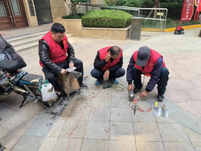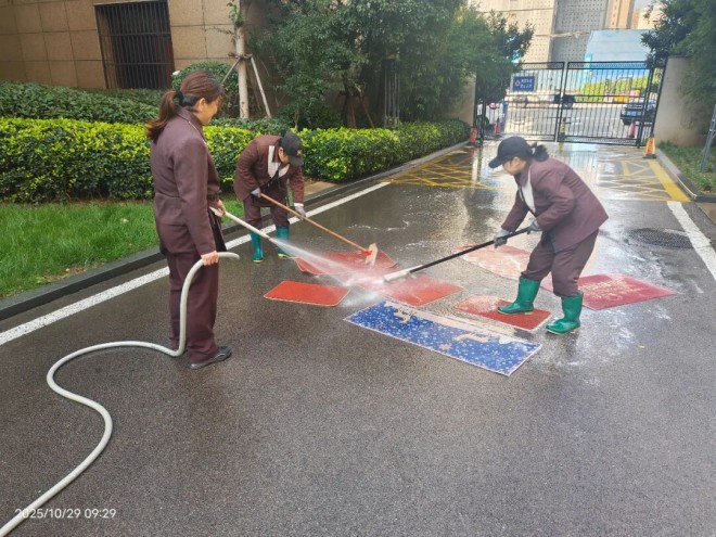 家門口的地墊易臟難洗、不易晾曬,物業工作人員便積極架起高壓水槍,免費為業主們沖刷、清洗家中的地墊。