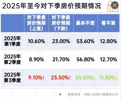 2025年第三季度,中國人民銀行在全國50個城市進行了2萬戶城鎮儲戶問卷調查,結果顯示:對下季房價,9.1%的居民預期“上漲”,55.6%的居民預期“基本不變”,23.5%的居民預期“下降”,11.8%的居民“看不準”。
