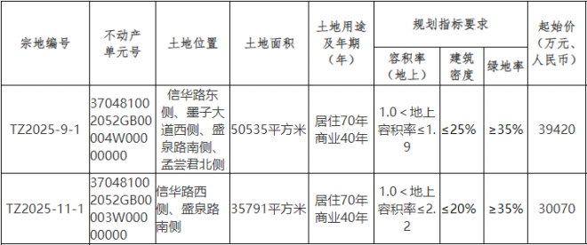 TZ2025-9-1號宗地,位于信華路東側、墨子大道西側、盛泉路南側、孟嘗君北側,土地面積50535平方米。土地用途及年期為居住70年商業40年。規劃指標要求:1.0<地上容積率≤1.9,建筑密度≤25%,綠地率≥35%。起始價39420萬元,按照最高容積率1.9計算,折合樓面價約4105.54元/平方米。