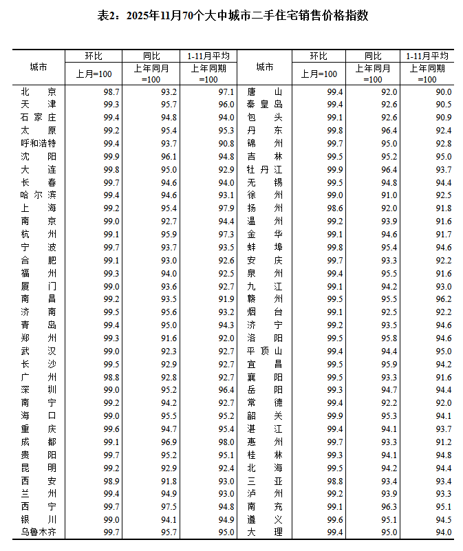 與新房不同,二手房市場仍在深度調整。國家統計局數據顯示,11月份二手房價同、環比均無城市上漲,已經連續三個月出現全跌局面。