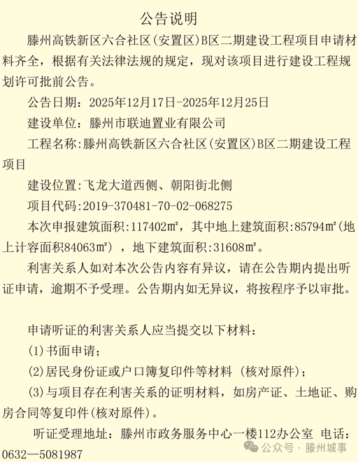 滕州高鐵新區六合社區(安置區)B區二期建設工程項目建設工程規劃許可批前公告