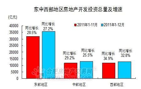 2011年,東部地區房地產開發投資35607億元,比上年增長27.2%,增速比1-11月回落1.3個百分點;中部地區房地產開發投資13197億元,增長25.5%,增速回落3.7個百分點;西部地區房地產開發投資12936億元,增長32.8%,增速回落2.1個百分點。