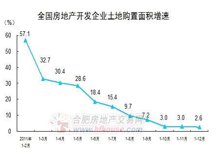 2011年,全國房地產開發企業土地購置面積4.10億平方米,比上年增長2.6%,增速比上年回落22.6個百分點,比1-11月回落0.4個百分點;土地成交價款8049億元,下降1.9%,而上年為增長59.3%,1-11月為增長4.3%。