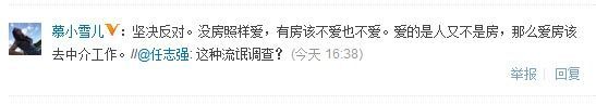 在大腕@任志強的轉發中,網友@慕小雪兒表示支持“不同意,遇到真愛的人比買套房子更重要”這一觀點。“堅決反對。沒房照樣愛,有房該不愛也不愛。愛的是人又不是房,那么愛房該去中介工作。”