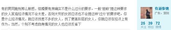 網友@有道張弛就支持這種觀點:有的男同胞別那么敏感,結婚要有房確實不是什么過分的要求。一般“膽敢”提這種要求的女人家庭經濟情況不會太差,否則太窮的女孩應該也不會提這種“過分” 的要求吧。你是什么經濟情況,就應該找差不多的女人,找了更高階層的女人,你就應該在經濟上有作為。當然,個別不考慮自身情況的女人也應該反省下。