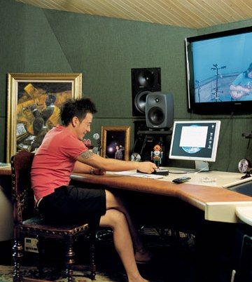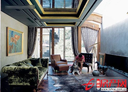 在楊坤的家里,你幾乎找不到一件顏色夸張跳躍的裝飾物。沉穩的色調、古樸的造型、典雅的設計,似乎一切都帶著時光留下的滄桑表情。門廳里的布藝沙發做工精良,扶手處略微上揚的角度和圓弧的線條,彰顯出低調的美麗。穿過門廳和餐廳,兩扇彩繪玻璃裝飾的大門帶給我們一種驚艷之感,推門而入,你會發現里面的會客區更具有鮮明的個人色彩。