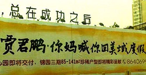 南京一開發商將火爆網絡紅人“賈君鵬”搬進了廣告詞:“賈君鵬,你媽喊你回××度假?!薄霸趺凑f呢?確實是有炒作的嫌疑。”這家樓盤的一名相關負責人直言不諱地說,這次借用就是為了提高樓盤的知名度和關注度。