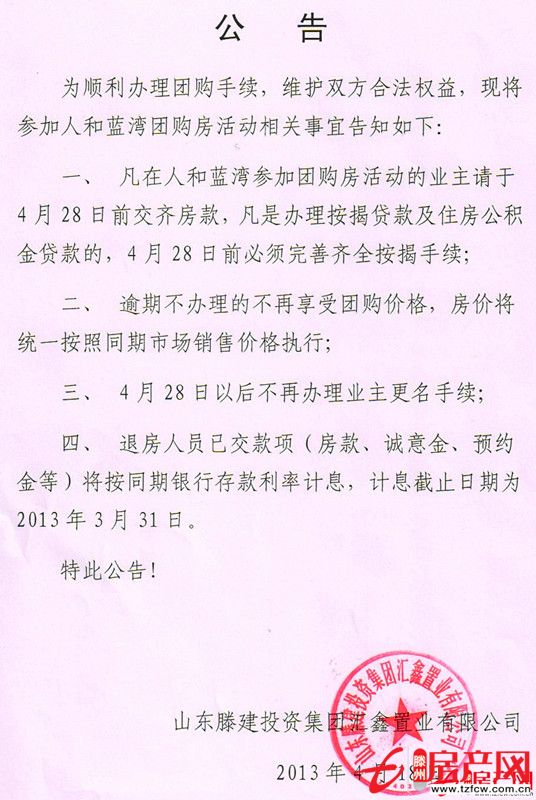 凡在人和藍灣參加團購房活動的業主請于4月28日前交齊房款,凡是辦理按揭貸款及住房公積金貸款的,4月28日前必須完善齊全按揭手續;
