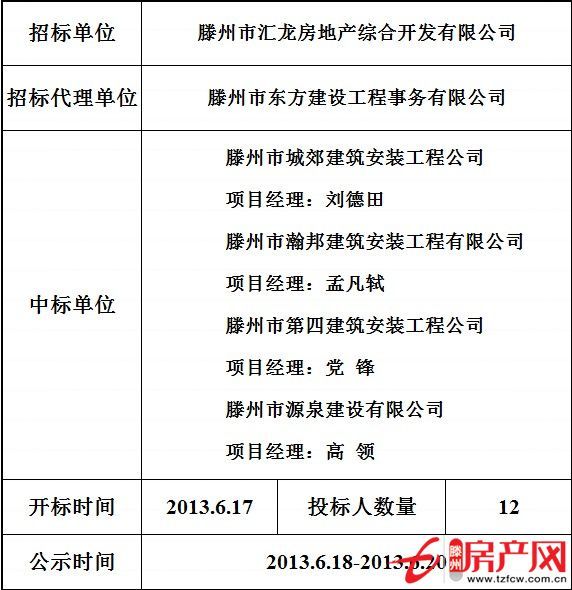根據《中華人民共和國招標投標法》等法律法規,匯龍·和諧康城B區二期工程第一標段經過公開招標,中標單位已經確定,現將有關情況公示如下: