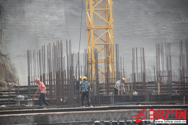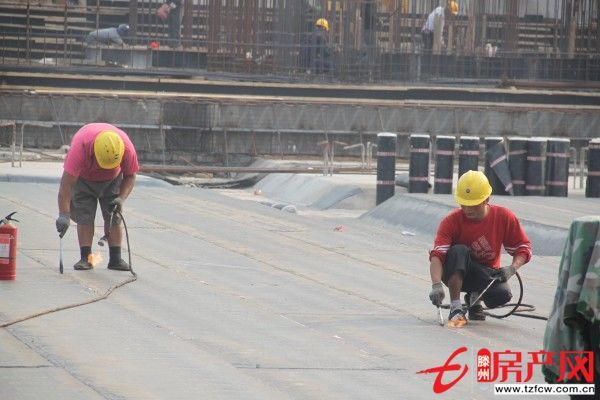 9日下午,中萬國際廣場施工現場處處是一片熱火朝天的施工場景,捆扎鋼筋、防水施工……