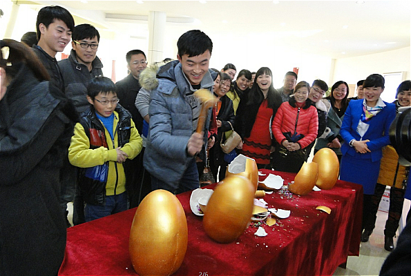 下午3點,活動正式拉開序幕,售樓處里來訪的客戶多達50余組,全都興致勃勃地圍在砸金蛋的活動現場前。據悉此次活動獎品極為豐厚,毛絨玩具、高級茶杯、茶藝爐、壓力鍋、洗衣機等等多達五六種的禮品讓人眼花繚亂。只見小錘一落,精美禮品紛紛花落各家,砸中大獎的客戶臉上樂開了花。在現場,記者注意到,很多客戶都是全家出動,在選擇金蛋時,更多的小朋友沖在前面紛紛挑選自己中意的金蛋,本次一等獎得主就是由一位小朋友選擇的,喜得大獎的胡女士十分高興,她說“自己開始時還在糾結挑選哪一個,兒子最終幫忙給挑了一個居然中了大獎,太高興了,回去要好好獎賞他一下”,“人和藍灣這個小區真的不錯,環境好,學校多,我以后會推薦更多的朋友來這邊看房子”。