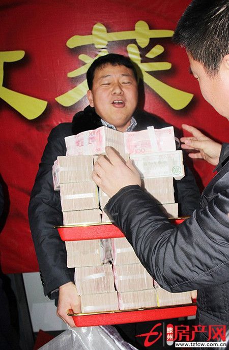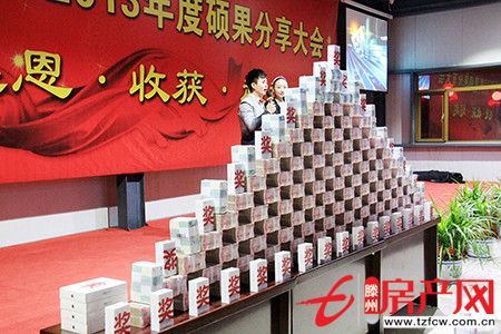 2014年01月21日,河南柘城,某地產全體員工召開“2013年度碩果分享大會”?,F場發放工資、獎金總額共達1100萬元,有的員工最多發200萬元,直接用麻袋裝現金。抽獎獎品包括30部iPhone5s、5臺42寸液晶電視、2部手提電腦、3臺空調及Ipad mini、電動車、電冰箱、相機等大獎。