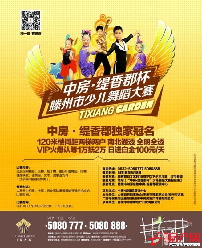 中房•緹香郡杯滕州市少兒舞蹈大賽將于2014年5月10日,在中房•緹香郡沿街廣場舉行。該比賽由山東省舞蹈家協會、棗莊市舞蹈家協會、滕州市文化廣播電視新聞出版局主辦, 滕州市中房房地產開發有限公司具體承辦。通過此次比賽發現和培養一批全面發展,具有一定舞蹈天賦的后繼人才,推動和繁榮我市少年兒童舞蹈的進步和創新。讓孩子們在舞蹈中發現美,創造美,體驗美。