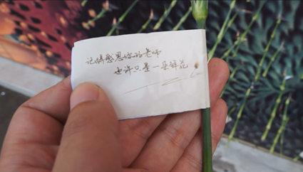 9月10日一大早,記者出門發現,火車站廣場有一巨大醒目的向日葵展板,旁邊還聚集了很多市民,好多圍觀的人都拿著康乃馨從人群里出來,這是怎么個事情?走近了一瞧,才發現這巨大的向日葵展板竟是暗藏玄機——密密麻麻的葵花籽兒分布其中,揪住一顆拔出來,卻是一枝美麗鮮艷康乃馨!
