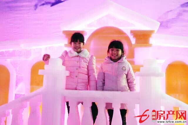 兩個小美女在冰橋上合影留念,粉色的羽絨服映紅了她們的小臉,你看他們笑得多開心~