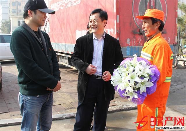 春雨行動此行走訪了王修峰、孫洪麗、狄憲才、孫維奎四人。在環衛處的一個公廁旁,一行人見到了正在忙碌的班長王修峰。他已經在這個平凡的崗位上堅守了28年,滕州的美麗包含著他不可磨滅的功勞。當我們把鮮花禮品送到他的手上,這位不善言辭的老班長真誠的笑容中,寫滿了感懷與激動。