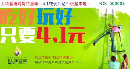 “全場賣2塊,都買2塊,買不買沒關系,到屋里瞧一瞧,到屋里看一看,真正的物超所值,真正的甩貨,拿啥啥便宜,買啥啥賤,挑啥拿啥都買2塊”,看到這的時候我相信你絕對不是讀出來的!2元店的東西想必大家都買過,但是4塊1毛錢在滕州你又能買到什么?或許你能吃一頓小碗、不加肉的“大肉面條”,或許你能吃一卷三個餅不加火腿和雞蛋的“純菜”菜煎餅,又或許屌絲一族買一卷衛生紙吧!如果要你花4.1元就能吃一頓東方豪客的豪華雙人套餐,或者看一場《速度與激情7》的電影,你愿意嗎?這個你必須答應,因為這個“我愿意”不像結婚時那么莊重,現在只要你參與【人和藍灣】的“4.1元純玩活動”就有機會實現夢想。