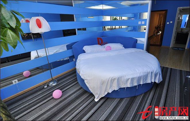 藍色給人一種干凈純粹的感覺,搭配圓床設計使房間更加柔和,再適當的添加一些鮮綠植物以及紅色點綴,房間更有趣味又個性。