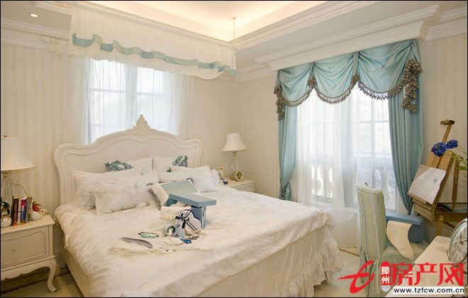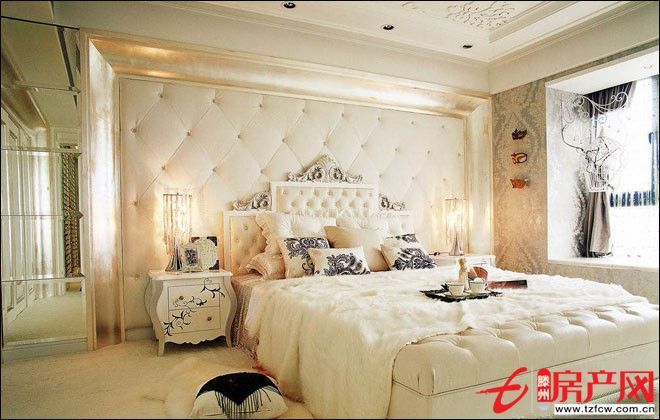 白色代表純潔、真誠。整個臥室散發著出中世紀宮廷的氛圍,精美的雕刻、華麗的鑲邊、雕花吊頂,洋溢著白色的浪漫,讓人癡迷。