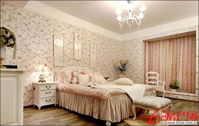 碎花床單、壁紙以及窗簾,滿屋的花瓣點綴,無比浪漫,處處洋溢著幸福與甜蜜。整個臥室主打田園風格,營造自由自在的氛圍。