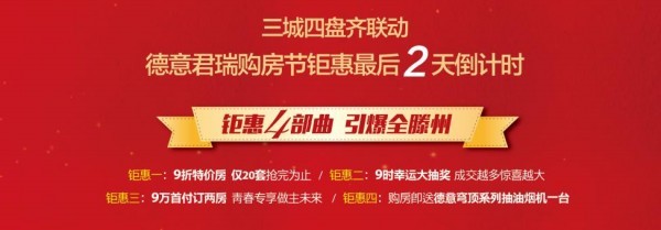 君瑞城作為此次購房節滕州站的品質大盤,推出四重鉅惠豪禮,勢必引來購房狂潮。鉅惠一:9折特價房,僅20套搶完為止;鉅惠二:9時幸運大抽獎,成交越多驚喜越大;鉅惠三:9萬首付訂兩房,青春專享做主未來;鉅惠四:購房即送德意穹頂系列抽油煙機一臺,如此優惠,僅獻給滕州的各位鄉親,究竟最終幸運大獎將花落誰家?君瑞城邀您親臨現場,見證大獎揭曉時刻。
