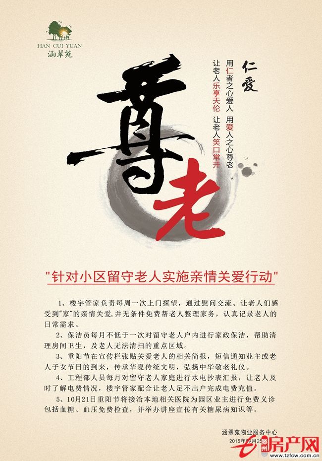 據悉,涵翠苑小區為我市銀鐘里區域拆遷回遷工程,留守老人較多。為了讓老人們度過一個和諧幸福的中秋佳節,該小區物業公司針對18戶留守老人開展了“送溫暖”親情行動,逐一登門拜訪,送去了月餅、食用油、面粉等食品,送去了真誠的關照和祝福。同時,該物業公司負責人還表示,下步還要對這些留守老人開展針對性的服務工作,由樓宇管家每周一次探望留守老人,解決老人的生活難題,記錄老人對物業公司的建議;由保潔員每月一次對留守老人進行家政保潔,主要清理房間衛生,及老人無法清掃的重點區域;由工程部人員每月一次對留守老人家庭進行水電抄表匯報,讓老人及時了解電費情況,配合讓老人足不出戶完成電費充值;還聘請本地醫院在“九九”重陽節期間開展血糖、血壓等免費醫療檢查,讓留守老人時刻了解自己的身體健康情況,共同打造鄰里一家、和諧幸福的社區文化。