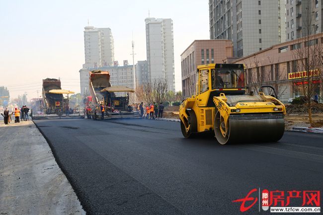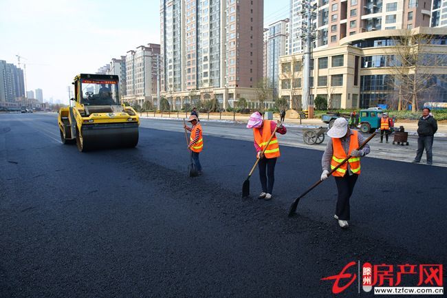 瀝青鋪設工程開始后,現場兩臺攤鋪機分頭開工,只見穿梭往來的運輸車將瀝青料倒入攤鋪機料倉內,攤鋪機沿著預先劃好的路線的緩慢前行,一條平整筆直的瀝青路在其后背后延伸,壓路機緊隨其后進行碾壓;在攤鋪過程中,現場技術人員推行施工精細化,在路面邊緣和拐角處不能機械攤鋪的,人工進行細致的處理。為解決路沿石與瀝青面層交界處碾壓盲區這一問題,采用小型壓路機專門反復碾壓結合縫,然后用人工找平的辦法,確保了工程質量。