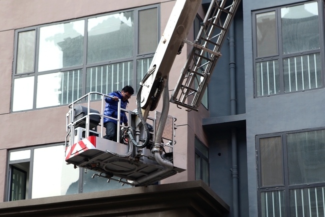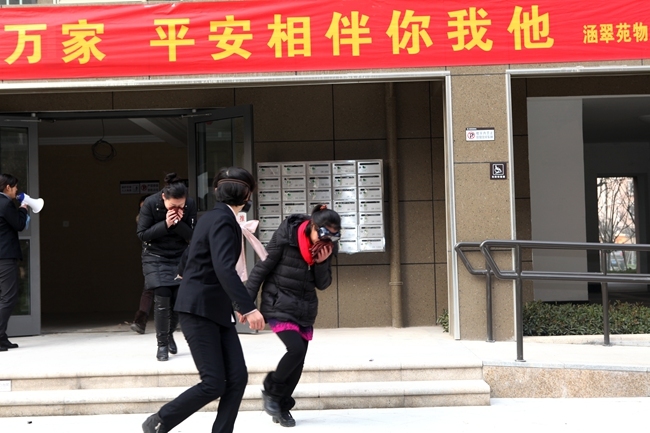 下午2:30,隨著該小區消防總控室內的警鈴驟然響起,消防演習活動正式開始。該演習分為兩套方案:一是小區28#樓發現火災險情,冒出滾滾濃煙,業主在物業服務人員的指導下按照既定逃生方案,在采取掩耳捂鼻等防范措施后,緊張有序地穿過濃煙,疏散到安全區域,并模擬業主受傷進行應急處理;二是模擬個別業主被困于火災現場,在窗口等待救援,消防員則通過消防云梯快速實施救援的場景。