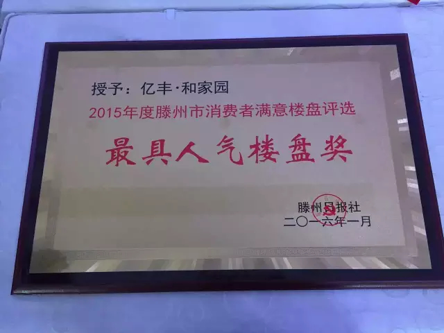 眾多精品樓盤競爭各項大獎,和家園作為億豐地產精心打造的高品質樓盤,在地段、環境、景觀、戶型、物業、配套等方面,獲得了廣大業主和市民的高度認可,此次活動經過近2個月的線上和線下投票評選,和家園獲得了2015年度滕州市消費者滿意樓盤“最具人氣樓盤獎”。