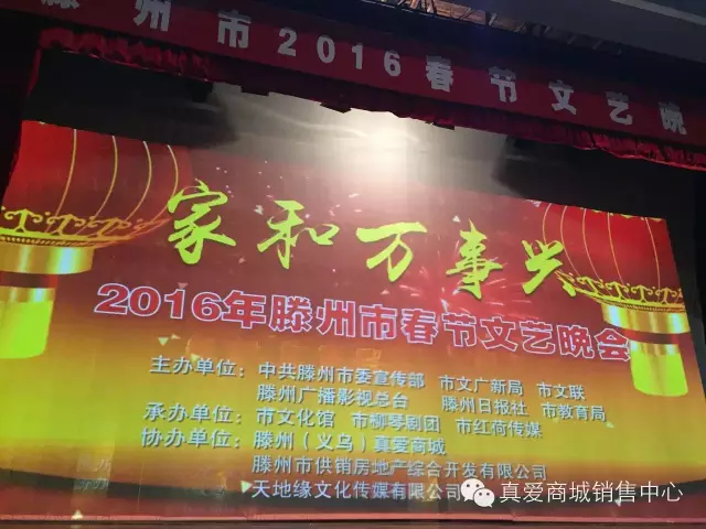 2016年2月4日,臘月二十六,在滕州市劇院演播大廳,由滕州市委宣傳部、市文廣新局、市文聯、廣播影視總臺、日報社、市教育局等單位主辦,滕州(義烏)真愛商城全程協辦的滕州市春節文藝晚會大型演出活動精彩上演。
