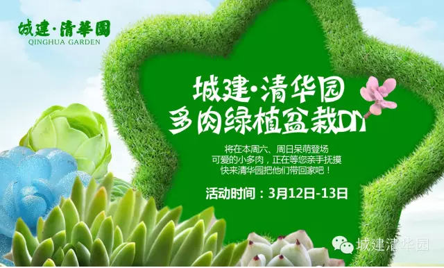 城建·清華園將發起“約會春天·擁抱綠色”主題活動,邀你一起呼吸春的氣息。本周末為多肉植物DIY活動,讓您玩轉一把清新范兒,做一個風情可愛的“小肉農”。